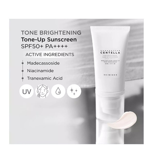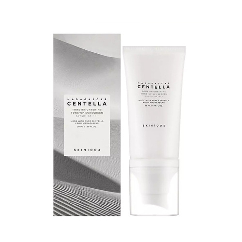 ضد آفتاب SKIN1004 Madagascar Centella Tone Brightening Tone-Up Sunscreen یک کرم ضد آفتاب سبک با++++ SPF 50+ PA است که علاوه بر محافظت قوی در برابر اشعههای مضر UVA و UVB، دارای خاصیت روشنکنندگی و یکنواختکننده رنگ پوست میباشد. این محصول با عصاره سنتلا آسیاتیکا ماداگاسکار غنی شده است که به تسکین و آبرسانی پوست کمک میکند. همچنین دارای جلوه تونآپ طبیعی است که بدون ایجاد حس سنگینی یا چربی، چهره را شاداب و درخشان نشان میدهد.